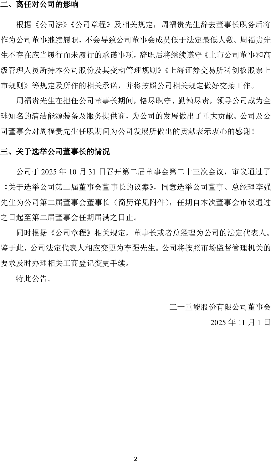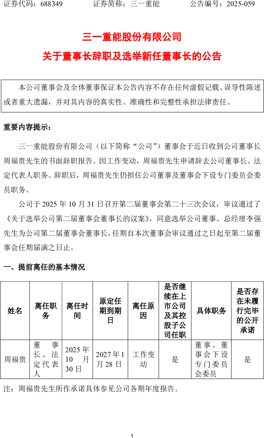 三一重能股份有限公司(以下簡稱“公司”)董事會于近日收到公司董事長周福貴先生的書面辭職報告。因工作變動,周福貴先生申請辭去公司董事長、法定代表人職務(wù)。辭職后,周福貴先生仍擔(dān)任公司董事及董事會下設(shè)專門委員會委員職務(wù)。